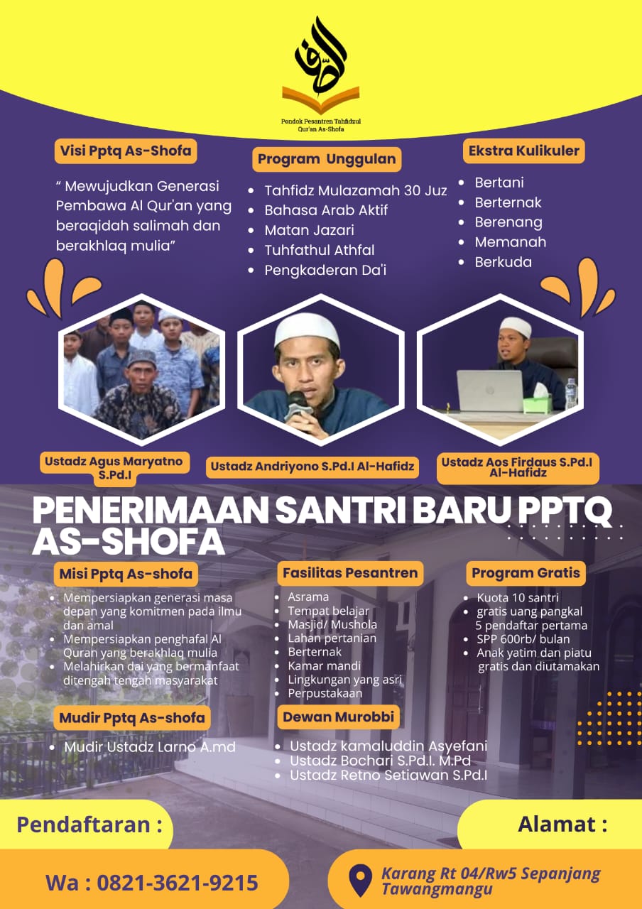 *PENDAFTARAN SANTRI BARU PONDOK PESANTREN TAHFIDZ AL-QUR'AN AS-SHOFA TAHUN AJARAN 2025/2026* Visi: " Mewujudkan Generasi Pembawa Al Quran yang beraqidah salimah dan berakhlaq…